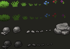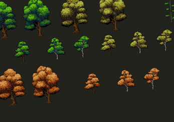 - Large Trees: Multiple detailed tree sprites with different foliage colors (Green, Autumnal Brown/Yellow/Orange) for seasonal or biome variety.
