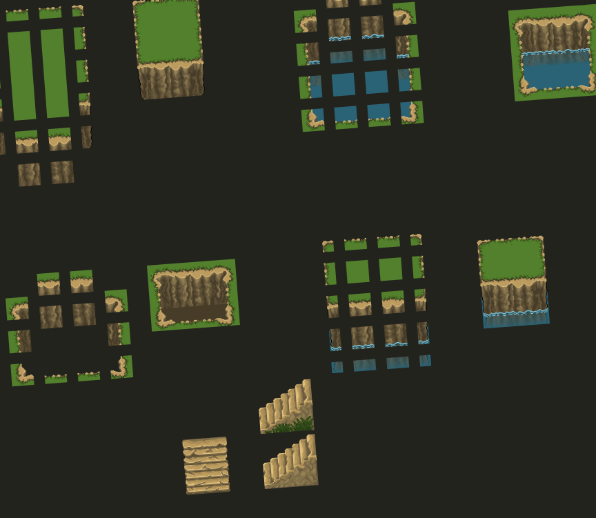 - Water Tiles: Pieces to create rivers, ponds, and coastlines, including transitional tiles where water meets grass/cliffs.