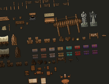 - Storage: Barrels, various stacks of crates, and logs. and Wagons (Caravans).